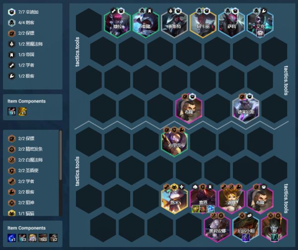 9人口羁绊:1猫猫、2精密发条(全队攻速BUFF)、2极客(其中一人带半件,开局变成装)、2保镖(专属护甲,开局嘲讽周围敌军,嘲讽成功加护盾)、2白魔法师(全队魔抗)、2圣盾使(施法加护盾)、2学者(全队回蓝BUFF)、2狙神(双C根据与敌军的距离加伤害)