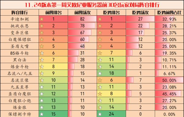 这次摩昂统计了统计艾欧尼亚服务器排名前30名大神们热补丁后的最近5场排位赛前4名的对局。共统计对局600场,涵盖了34套阵容体系,去重后共进入前四场次560场对局,吃鸡场次140场。