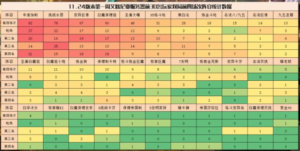 大家可在图中清晰看到各个阵容对局的一、二、三、四名,能更容易理解阵容趋势变化与阵容强度。数据统计真的不容易啊,兄弟们记得给摩昂点个赞哦!万分感激!!!