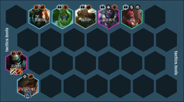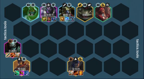 阵容组成:厄加特、扎克、蔚、丽桑卓、蒙多、塔姆、金克斯、维克托