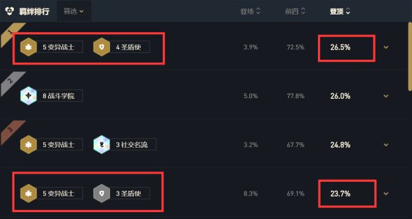 最为直接的数据显示,在新版本5变异4圣盾使和5变异3圣盾使的吃鸡率直接高达26.5%和23.7%位列第一和第四,因此当前版本的版本答案到底玩什么,小嗨也不用多说了。