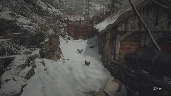禽肉x3:村庄中部,红烟囱房间旁边的空地上有三只鸡在乱跑,从房顶上也能看到