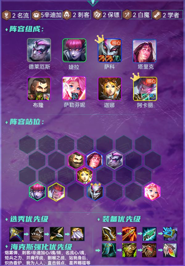 辛迪加刺版本更新后1星阿卡丽大砍,辛迪加刺的强度是没有上版本强势的,但阵容只要阿卡丽来的早,吃分还是比较稳定的,2星阿卡丽强度未变,吃鸡依然强势。,阵容方面现在还是主要2套阵容,一套走4/6刺,一套挂名流,强度上相差不多,4/6刺更暴力,挂名流更稳定,转型也更容易。