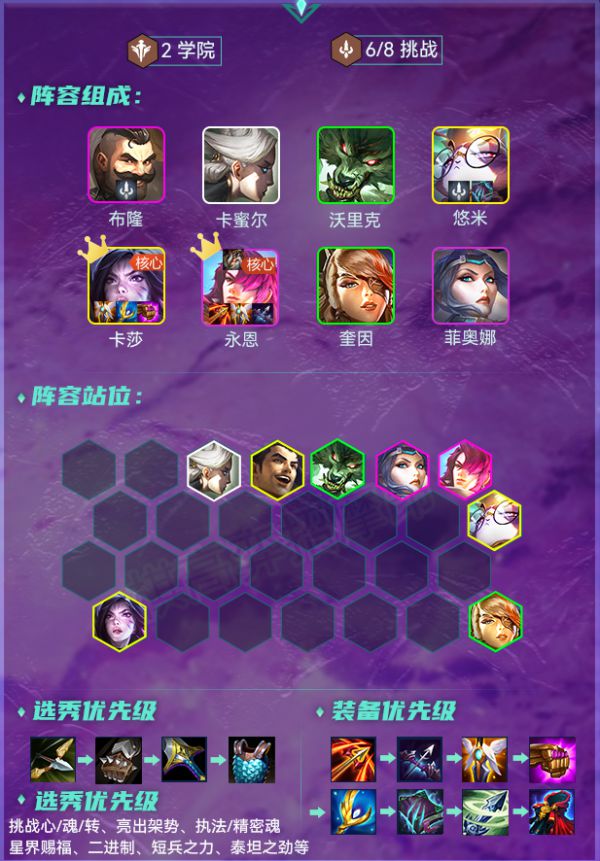 6/8挑战在热补丁更新后,修复BUG,看似强度有所下降,但也增加了攻击力,另外这版本卡莎强度略有超模,6/8挑战的强度依然非常不错,吃分与吃鸡相对稳定。金铲铲玩家也可选择。