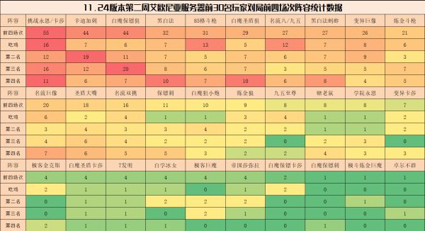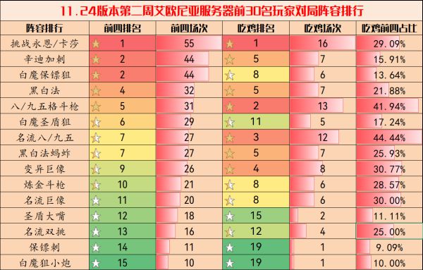 这次摩昂统计了统计艾欧尼亚服务器排名前30名大神们热补丁后的最近5场排位赛前4名的对局。共统计对局600场,涵盖了30套阵容体系,去重后共进入前四场次480场对局,吃鸡场次120场。