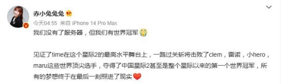 知名游戏解说“赤小兔兔兔”表示,“我们没有了服务器,但我们有世界冠军!”这一词条也成功冲上微博热搜第七。