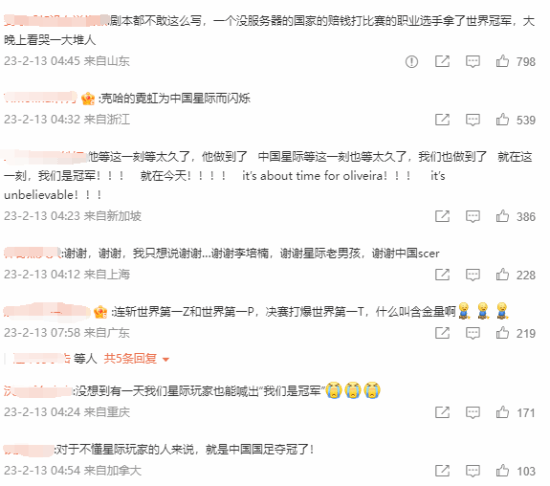 这是中国《星际争霸》比赛二十多年来首个男子单人世界冠军,该话题也登上微博热搜,网友表示:剧本都不敢这么写,一个没服务器的国家的赔钱打比赛的职业选手拿了世界冠军,大晚上看哭一大堆人;没想到有一天我们星际玩家也能喊出“我们是冠军”。还有网友调侃,这都相当于国足夺冠了。