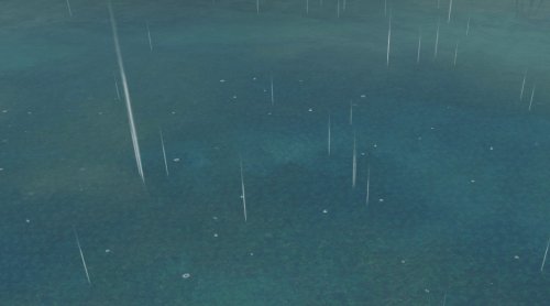 除上述以外,不得不提积水效果。小木舟的船檐比较平坦,因而积水也只是浅浅的一滩;若登上宽阔的游船,会发现船头积蓄的雨水更多,雨滴落入其中,会泛起涟漪。