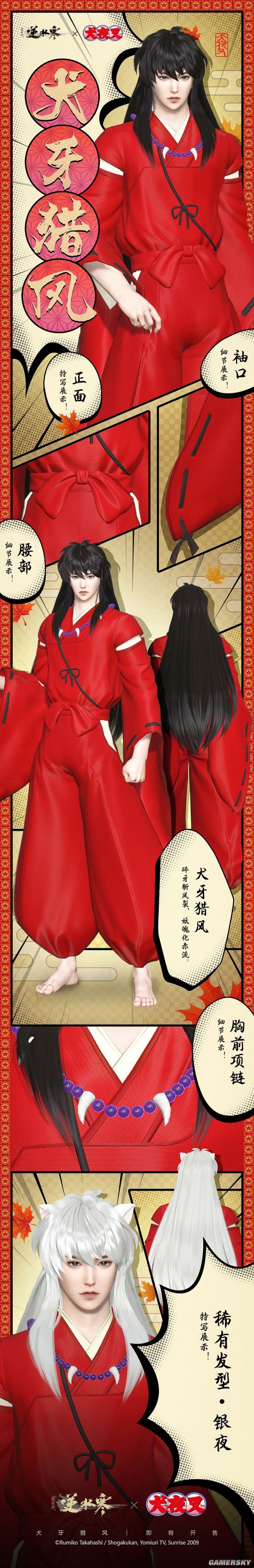 时装“犬牙猎风”是犬夜叉同款狩衣。他的外衣乃传说之物火鼠裘,其色鲜红如火。胸前紫红色的言灵念珠沉稳温润,既是束缚,也是穿越时空的思念与牵挂。