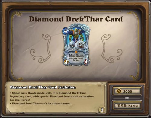 钻石卡是《炉石传说》近年引进的全新版本卡牌,在金卡版本的基础上,具有更加出色的的特效以及进场动画。当然,这也是他价格不菲的原因:在奥山之战活动结束后,钻石卡“范达尔·雷矛”全服免费发放,而作为部落方的钻石卡“德雷克塔尔”需要玩家花费3000金币才能获得。
