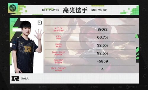 3分钟RNG拿下一血;10分半RNG中野配合击杀对方中单,顺势拿下小龙;11分钟RNG利用先锋推掉下一血塔;11分半对方2包1RNG中路,RNG反打1换1;12分钟RNG下路组转线上路,并击杀对方上单;17分钟RNG利用先锋推掉了对方中路2座塔;23分半团战RNG击杀对方打野,随后拿下大龙;26分钟RNG一波高地推进拿下比赛!本局MVP给到GALA霞!