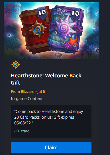 该消息来自国外论坛Reddit,不过并不是所有回归玩家都有如此丰厚的奖励,还有一些回归玩家表示自己虽然也收到了卡牌包,但却只有20包。