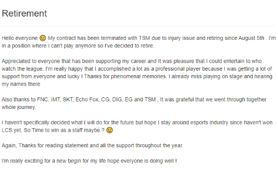 大家好,由于伤病我与TSM合同也已在8.5到期,我的身体状态无法支持我继续下去,所以我决定退役。