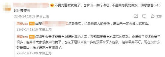 WE老板也发博致歉,称责任在自己。并表示:“感谢到今天还能看完16场比赛的大家,深知每周看完比赛后的煎熬。今年做了很多也错了很多,但并非大家想象中的躺平,也花了建队来第二多的预算来买人组队,但结果并不好。现在说什么都是借口,除了道歉只有谢谢了。”